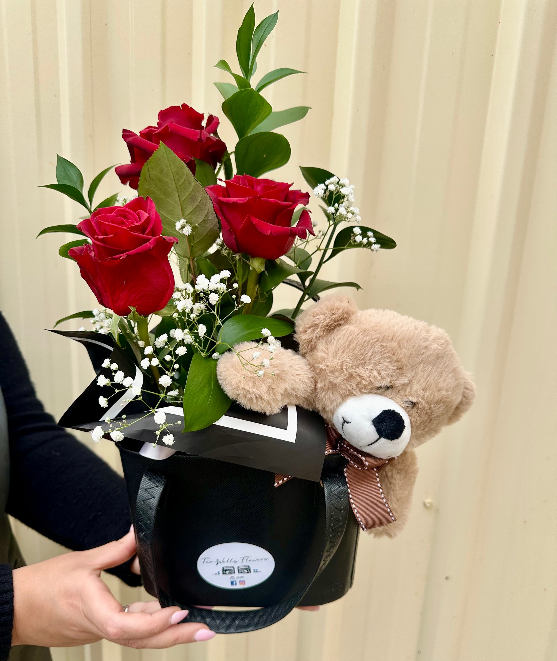 Our Bag of Love is the perfect little gesture to melt hearts. Featuring red roses nestled among fresh greenery and beautifully presented in our black hand bag and finished with an adorable plush teddy bear peeking out the side.