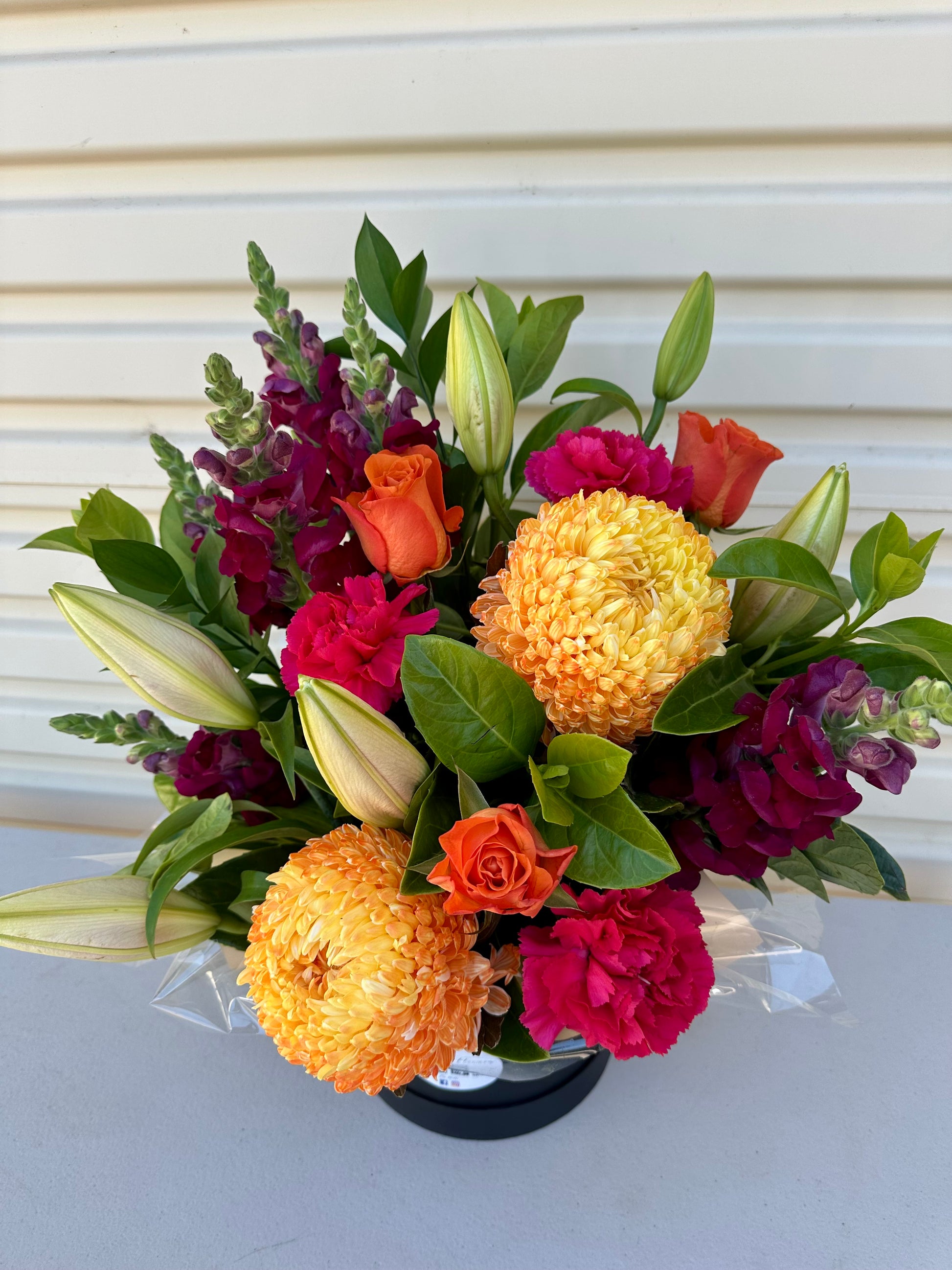 Seasonal flowers arranged in a hat box. Flower varieties and colours are subject to availability. Our florist will create a beautiful arrangement in a similar style if specific blooms are unavailable.
